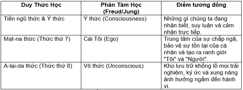 Phương pháp: Phân tâm học dùng đối thoại, phân tích giấc mơ và liên tưởng tự do. Duy Thức Học dùng Thiền quán để nhìn thấu bản chất "Vạn pháp duy thức" và chuyển hóa các thức thành trí tuệ.